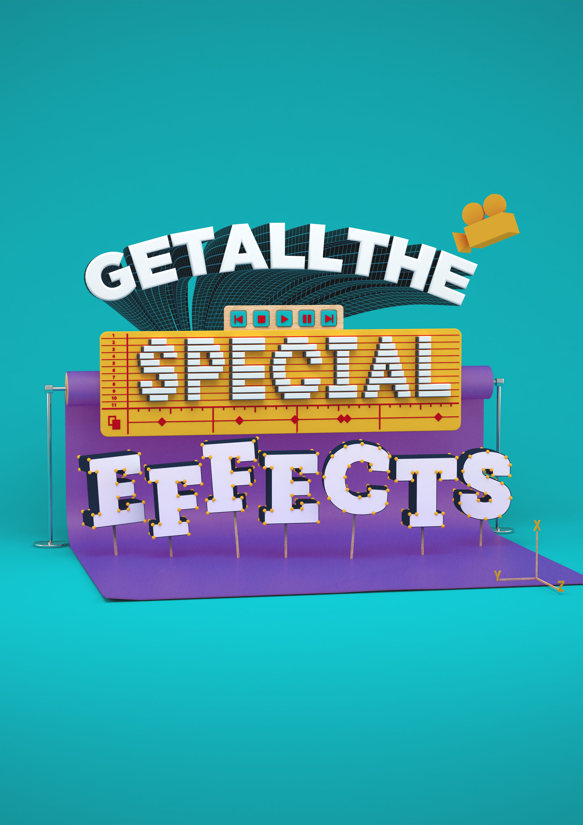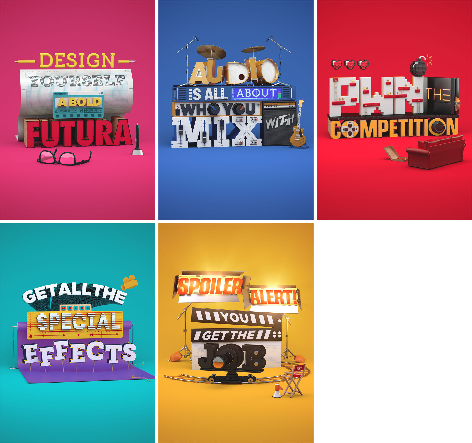A series of key visuals and animations, each representing a different tertiary course that SAE Qantm offer - Audio Engineering, Design, Animation & Special Effects, Film and Gaming & Mobile.